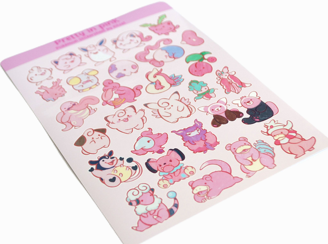 This sticker sheet includes 29 different pink pokemon on one A5 sheet, isn't that neat?